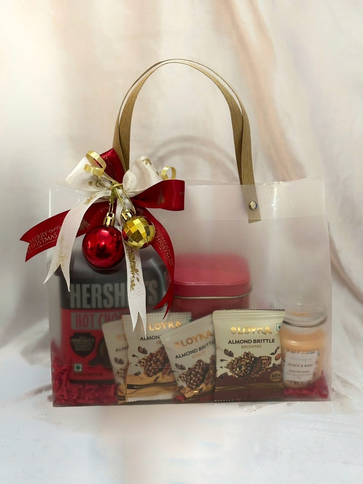 Hershey’s cocoa powder, 200gms Plum cake slices, 4pcs Almond Brittle, 1 scented jar candle